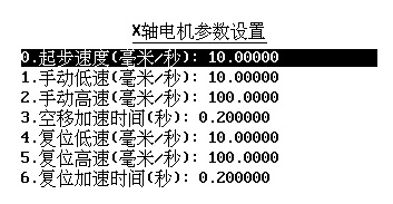 1) 起步速度: 一般步進(jìn)電機(jī)的起步速度應(yīng)小于3轉(zhuǎn)/秒,伺服電機(jī)小 于5轉(zhuǎn)/秒 2) 手動(dòng)低速: 手動(dòng)教導(dǎo)時(shí)用來精確定位 3) 手動(dòng)高速: 手動(dòng)教導(dǎo)時(shí)用來快速定位 4) 空移加速時(shí)間: 由起步速度變化到空移速度所需要的時(shí)間,該值 越小,速度變化越快.若設(shè)置為0則為勻速。 5) 復(fù)位低速: 復(fù)位時(shí)用來精確定位 6) 復(fù)位高速: 復(fù)位時(shí)用來快速定位 7) 復(fù)位加速時(shí)間: 由復(fù)位低速變化到復(fù)位高速所需要的時(shí)間,該值越小,速度變化越快.若設(shè)置為0則為勻速。 手動(dòng)微調(diào)脈沖數(shù):手動(dòng)控制各軸運(yùn)動(dòng)時(shí),每次快速按下各軸運(yùn)動(dòng)鍵時(shí),系統(tǒng)所發(fā)出的脈