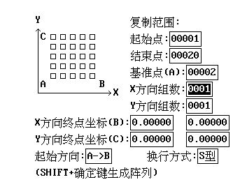 復(fù)制范圍:需要復(fù)制的圖形的起始加工點(diǎn)號(hào)和結(jié)束加工點(diǎn)號(hào)。 基準(zhǔn)點(diǎn)A:需要復(fù)制的圖形上的某個(gè)參考點(diǎn),教導(dǎo)XY方向間距時(shí)需要以 該點(diǎn)為基準(zhǔn),默認(rèn)為選擇圖形的第一個(gè)點(diǎn)。 X方向組數(shù):陣列的X方向組數(shù)。 Y方向組數(shù):陣列的Y方向組數(shù),只復(fù)制一次則將XY方向組數(shù)均設(shè)成1。 X方向終點(diǎn)B坐標(biāo):該坐標(biāo)必須是X方向最后一組對(duì)應(yīng)基準(zhǔn)點(diǎn)A的坐標(biāo)。 可直接按教導(dǎo)按鈕將當(dāng)前坐標(biāo)教導(dǎo)進(jìn)去。 Y方向終點(diǎn)C坐標(biāo):該坐標(biāo)必須是Y方向最后一組對(duì)應(yīng)基準(zhǔn)點(diǎn)A的坐標(biāo)。 可直接按教導(dǎo)按鈕將當(dāng)前坐標(biāo)教導(dǎo)進(jìn)去。 起始方向:是先由A到B還是先由A到C。 換行方式:有S形和Z形兩種,Z形換方式當(dāng)加工完一行后會(huì)返回到起始 點(diǎn)開始加工下一行,S形換行則不會(huì)返回起始點(diǎn)而是以直接折回的方式 加工下一行。 按下定位鍵可定位到基準(zhǔn)點(diǎn)。 東莞市金裕自動(dòng)化機(jī)械設(shè)備有限公司成立于2000年,金裕坐落于東莞市大嶺山向東工業(yè)區(qū),創(chuàng)辦硅膠、PVC商標(biāo)禮品生產(chǎn)設(shè)備.金裕研發(fā)的全自動(dòng)全自動(dòng)點(diǎn)膠機(jī)、矽膠機(jī)、油壓機(jī)、KPU鞋材機(jī)以及終于實(shí)現(xiàn)了的智能無人車間生產(chǎn)流水線,金裕的自動(dòng)化設(shè)備可以做到讓你省人、省電、省管理。金裕公司歡迎新老顧客來訪,選擇金裕,沒有顧慮。m.shanghaizhaojing.com |