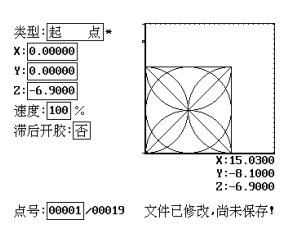 點(diǎn)膠機(jī)--高級(jí)編輯功能-常用圖形 9)程序展開 該功能將選擇范圍內(nèi)的“程序調(diào)用”和“文件調(diào)用”指令進(jìn)行展開,將調(diào)用的內(nèi)容直接插入到該指令的位置。注意調(diào)用次數(shù)為0的調(diào)用指令不能展開。也可在文件編輯界面按Shift+2展開當(dāng)前一條“程序調(diào)用”或“文件調(diào)用”指令,不是這兩種類型的指令不能展開。 10)常用圖形l 測(cè)試圖形 第一步:選擇測(cè)試圖形所在平面; 第二步:輸入測(cè)試圖形邊長(zhǎng); 第三步:教導(dǎo)第三軸坐標(biāo); 第四步:生成如下圖形: