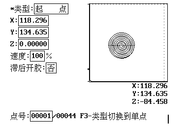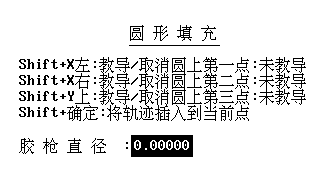 l 圓形填充 教導(dǎo)需要填充的圓形的圓周上三個(gè)點(diǎn),自動(dòng)生成類似于螺旋線的填充圖形。當(dāng)膠槍直徑無(wú)法被圓形半徑整除時(shí)會(huì)提示是否放大或縮小膠槍直徑來(lái)使膠槍直徑能被圓形半徑整除。