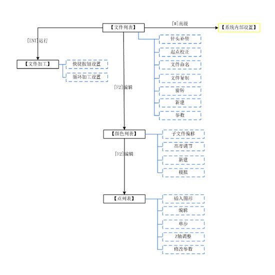 ![]() 上圖為示點(diǎn)膠機(jī)的手柄盒操作界面層次示意圖。用戶主要用到的就是4個(gè)相關(guān)界面:【文件列表】、【顏色列表】、【點(diǎn)列表】、【文件加工】。