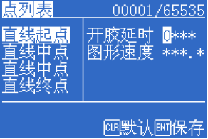1.1 點(diǎn)膠機(jī)圖形參數(shù)修改在【點(diǎn)列表界面】里,按下“[F4]參數(shù)”可以編輯當(dāng)前點(diǎn)的參數(shù)。 所有延時(shí)參數(shù)的單位都是ms,距離參數(shù)的單位都是mm,速度參數(shù)的單位是mm/s。 當(dāng)參數(shù)顯示***時(shí),表示使用的是文件的參數(shù)。經(jīng)過修改后,就使用自己獨(dú)立的參數(shù)了。按下“[CLR] 默認(rèn)”可恢復(fù)成****默認(rèn)參數(shù)。修改好后按[ENT]快速保存。 可修改的參數(shù)和作用的點(diǎn)類型如下表所列: