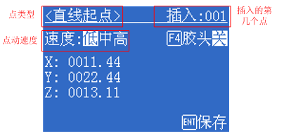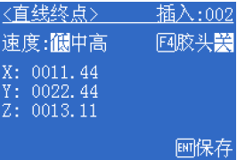 金裕點(diǎn)膠機(jī)插入直線示例 如圖所示,直線由直線起點(diǎn)和直線終點(diǎn)2點(diǎn)組成 在點(diǎn)類型界面中按“[3]直線”,第一步要插入一個(gè)直線起點(diǎn),如圖