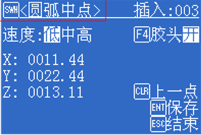 插入多段線-第2點 點動到合適位置后,按[ENT]保存。示教盒跳入示教第3點的界面中。第3點要求是點類型是圓弧中點。注意到在插入多段線時,點類型前有[SWH]按鈕,按下[SWH]可切換當(dāng)前點類型。如圖3-23所示。