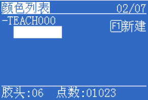 示教文件中還不存在任何顏色,需要再新建一個(gè)顏色。再按[F1] 新建一個(gè)顏色。新建之前需要先選擇當(dāng)前顏色對(duì)應(yīng)的膠頭號(hào),如圖3-14。